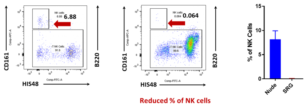 The SRG Platform is a Sprague-Dawley rat with a double knockout for the Rag2 and Il2rgamma genes (SD-Rag2tm2hera Il2rgtm1hera). SRG is a severely immunodeficient rat that lacks B-cells, T-cells, and NK-cells and was first introduced to enable and accelerate xenograft efficacy studies.